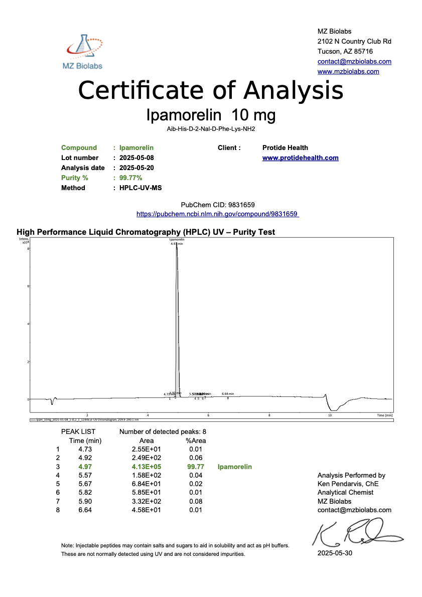 The information provided in this description is for research purposes only. The Ipamorelin peptide is not approved by the U.S. Food and Drug Administration (FDA) or any regulatory authority for human consumption or therapeutic use. It is intended solely for investigational use in controlled laboratory settings by qualified researchers. Protide Health does not endorse or promote the use of Ipamorelin peptide in humans or animals outside of approved research protocols. Researchers must comply with all applicable local, state, and federal regulations, including obtaining necessary approvals for experimental use. Consult with regulatory authorities before initiating any research involving Ipamorelin peptide.